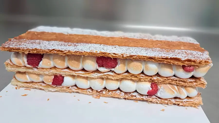 Delicado corte de hojaldre caramelizado y merengue italiano que hace las delicias de los más golosos.