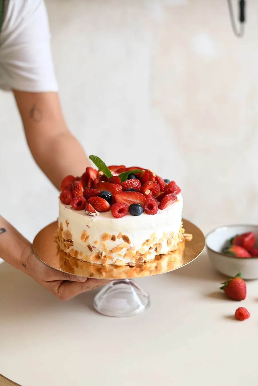 Bizcocho de vainilla relleno de mermelada de fresa y nata, con “topping” de nata y fresas naturales.